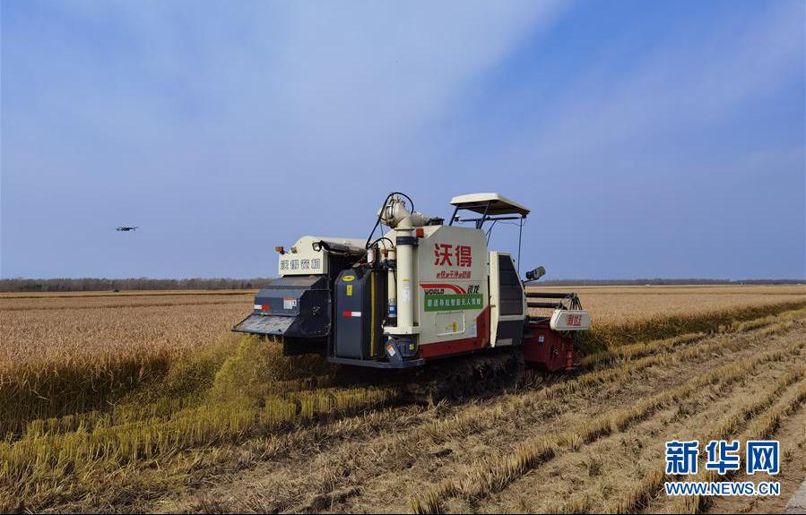 在黑龙江垦区七星农场举办的农机无人驾驶作业演示会现场,一台无人驾驶收割机在稻田内演示收割作业。新华社记者 孙晓宇 摄